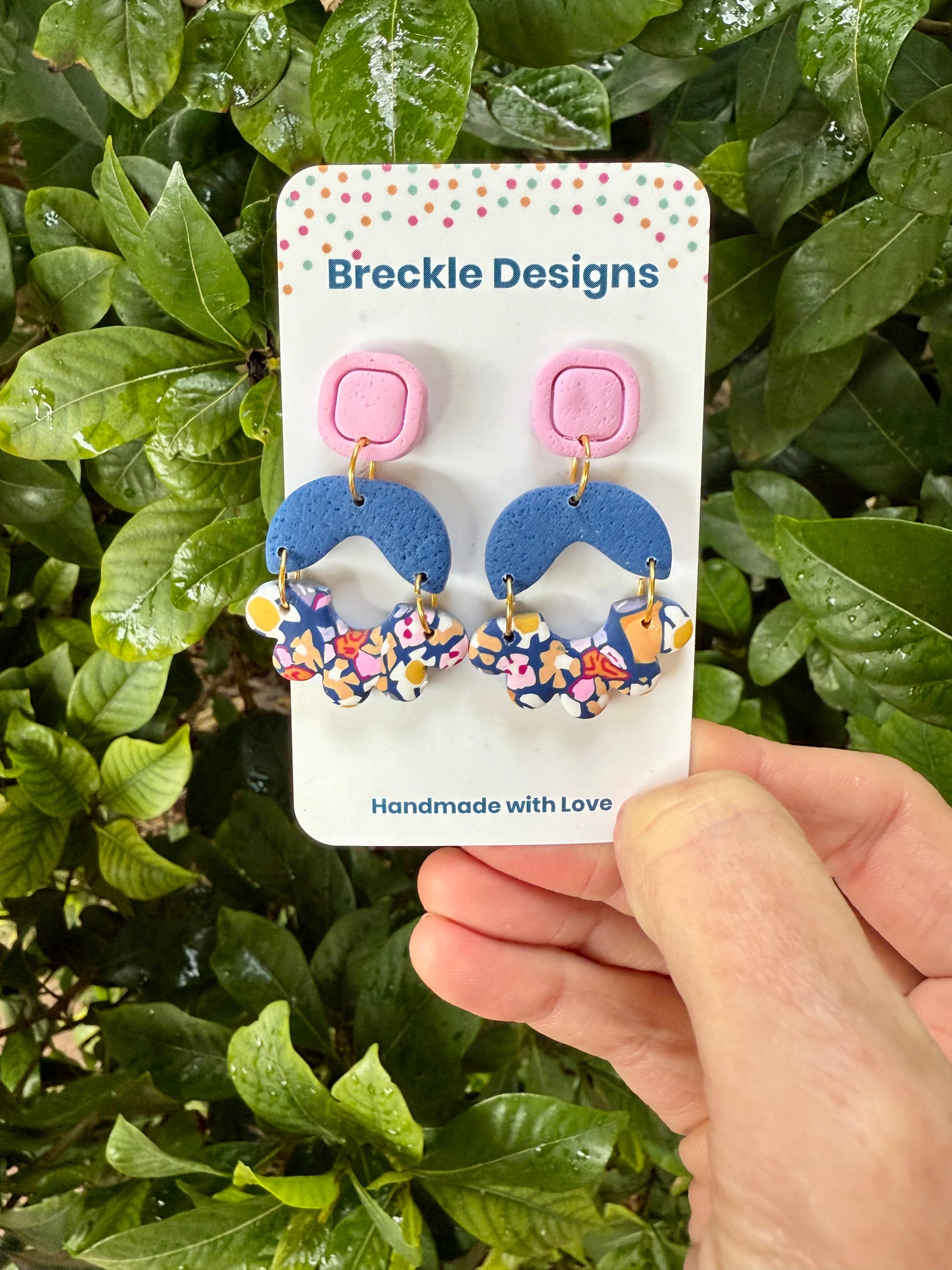 Your earrings are handmade from Polymer Clay. They are durable however treat with care. Please store in a clean and dry area and avoid swimming and showering.