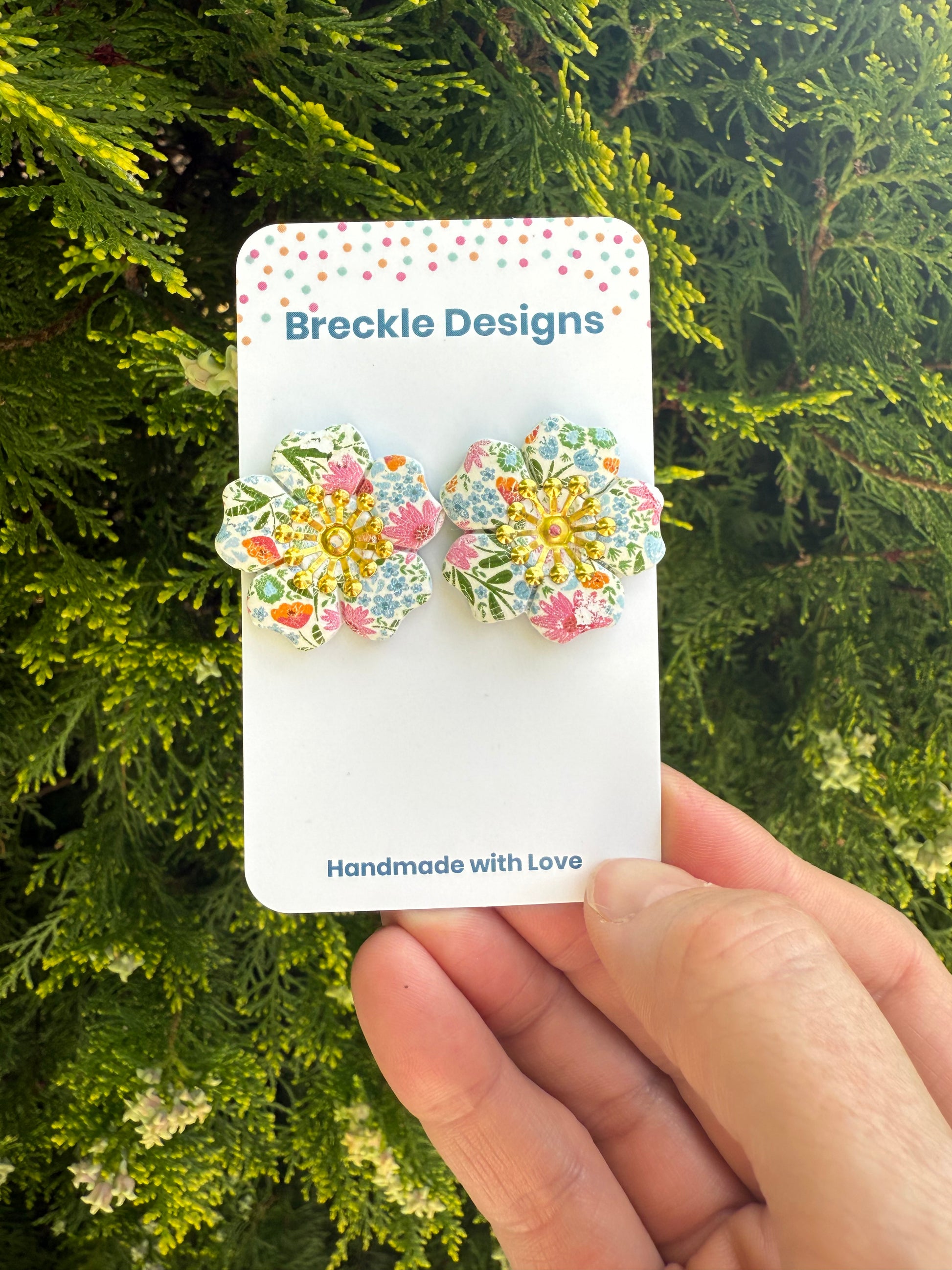 Your earrings are handmade from Polymer Clay. They are durable however treat with care. Please store in a clean and dry area and avoid swimming and showering.